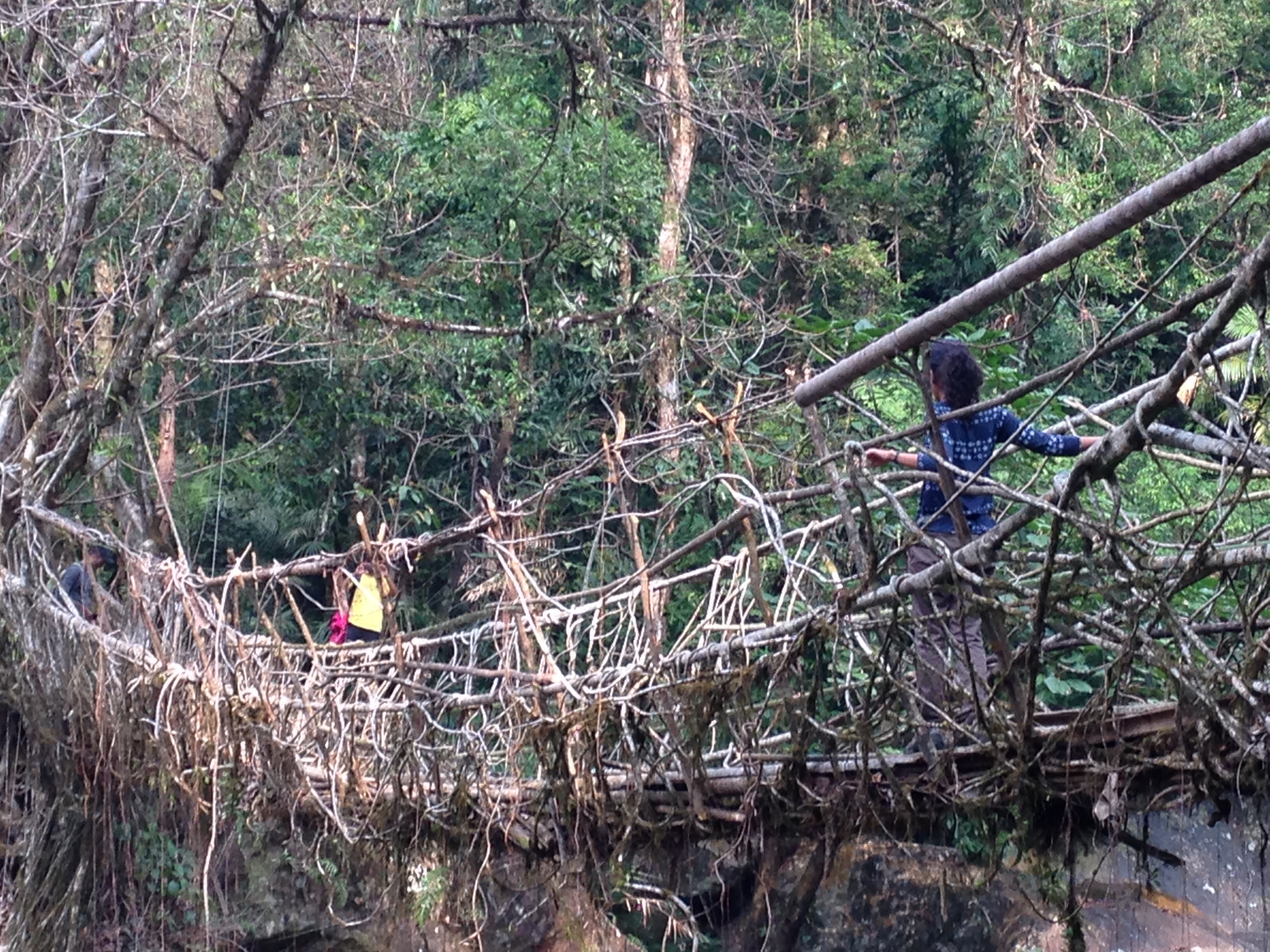 8am: Trepid exit from Sa-I-Mika. Cramped taxi ride to a village from which we walked an hour downhill (a few thousand steps only, on shivering legs) to a living roots bridge. What’s that? Rubber tree roots are used on two sides of a river to build a bridge. Like this one.