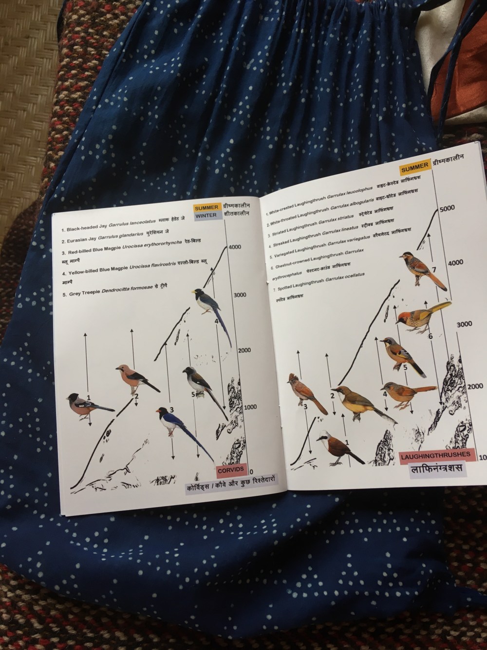 On my second day at Munsiari, I set another alarm for 5.45 and get set to go watch some birds. This meant a hike up to the maidan, to what seems like the HQ of the Himal Kalasutra festival. There’s a tent, registration, beautiful locally made cloth backpacks that contain the kit for the endeavour-an equally thoughtfully and aesthetically produced book about birds of Munsiari, a notepad and pen.