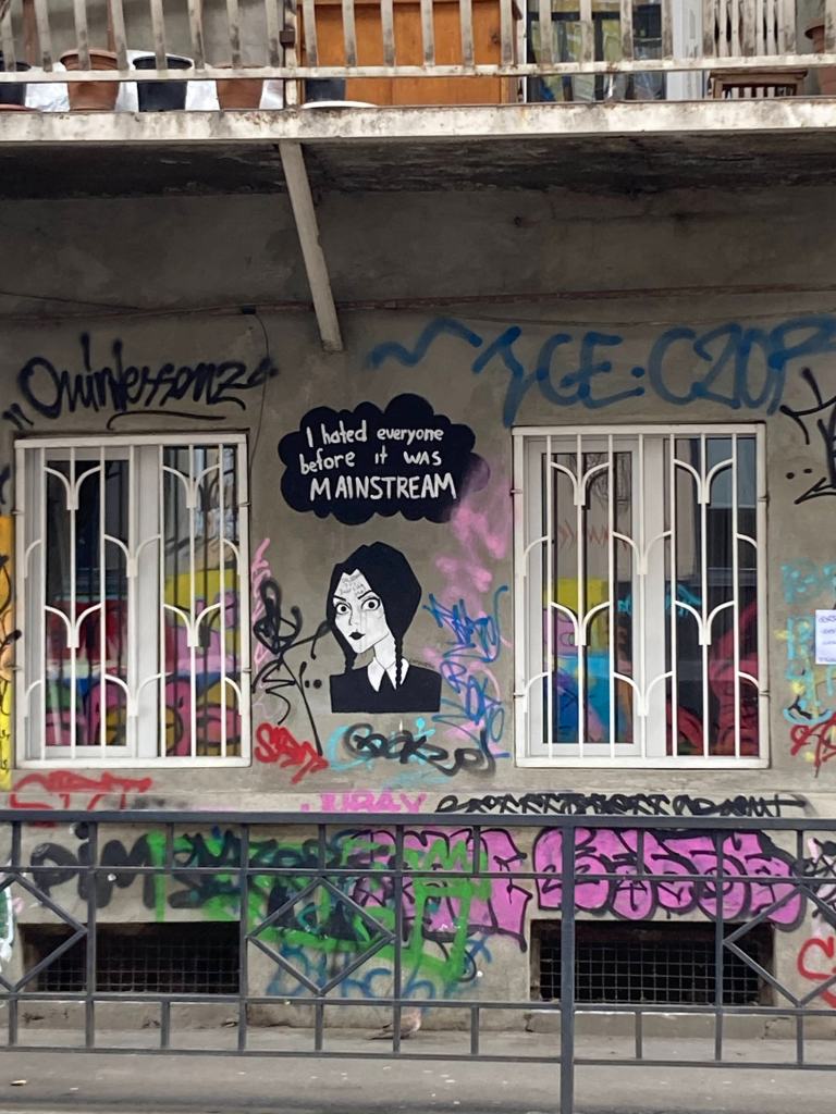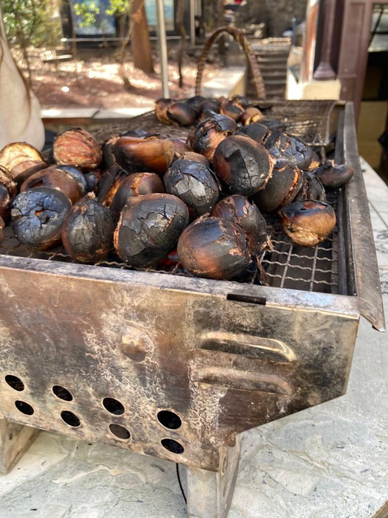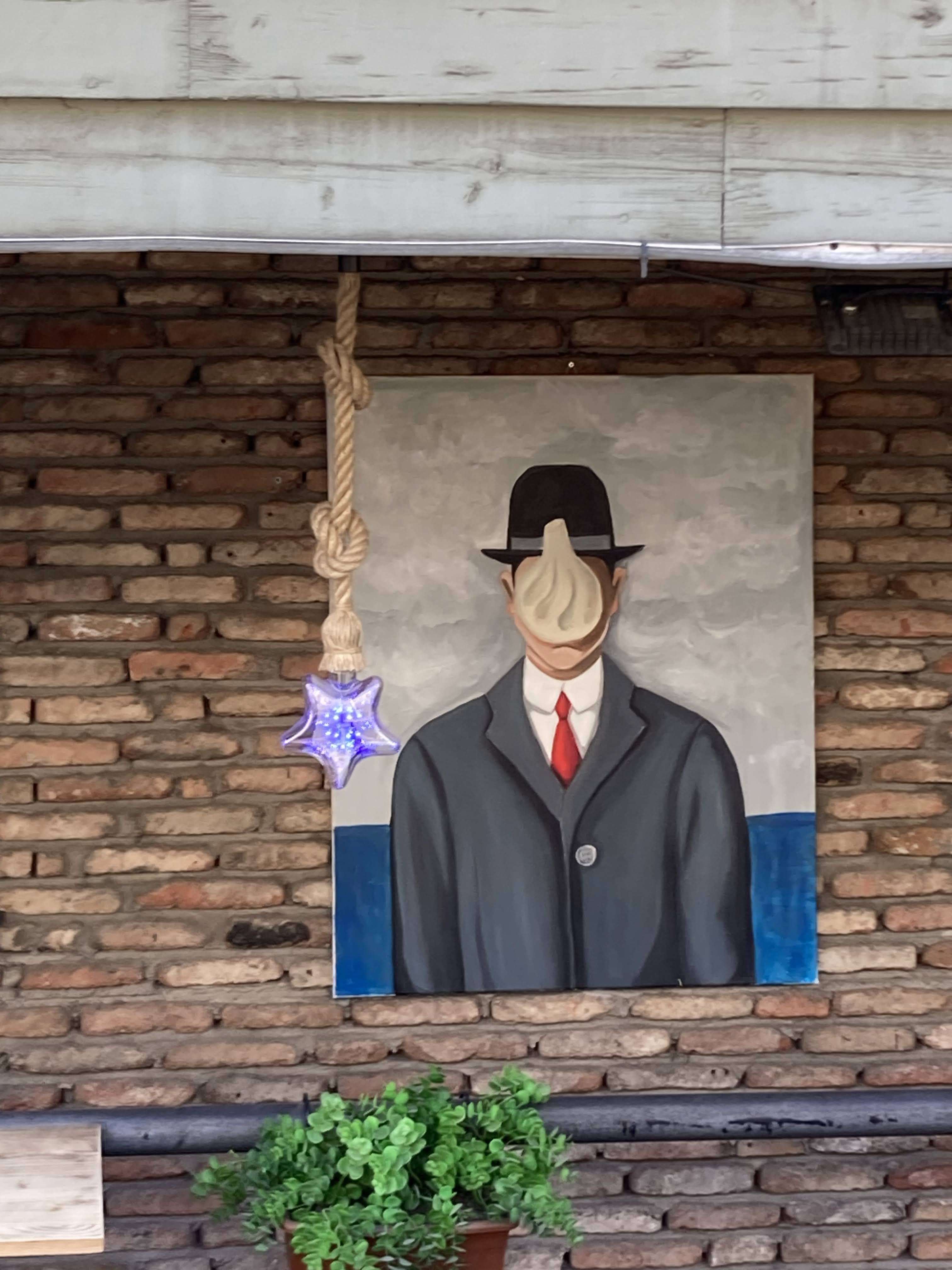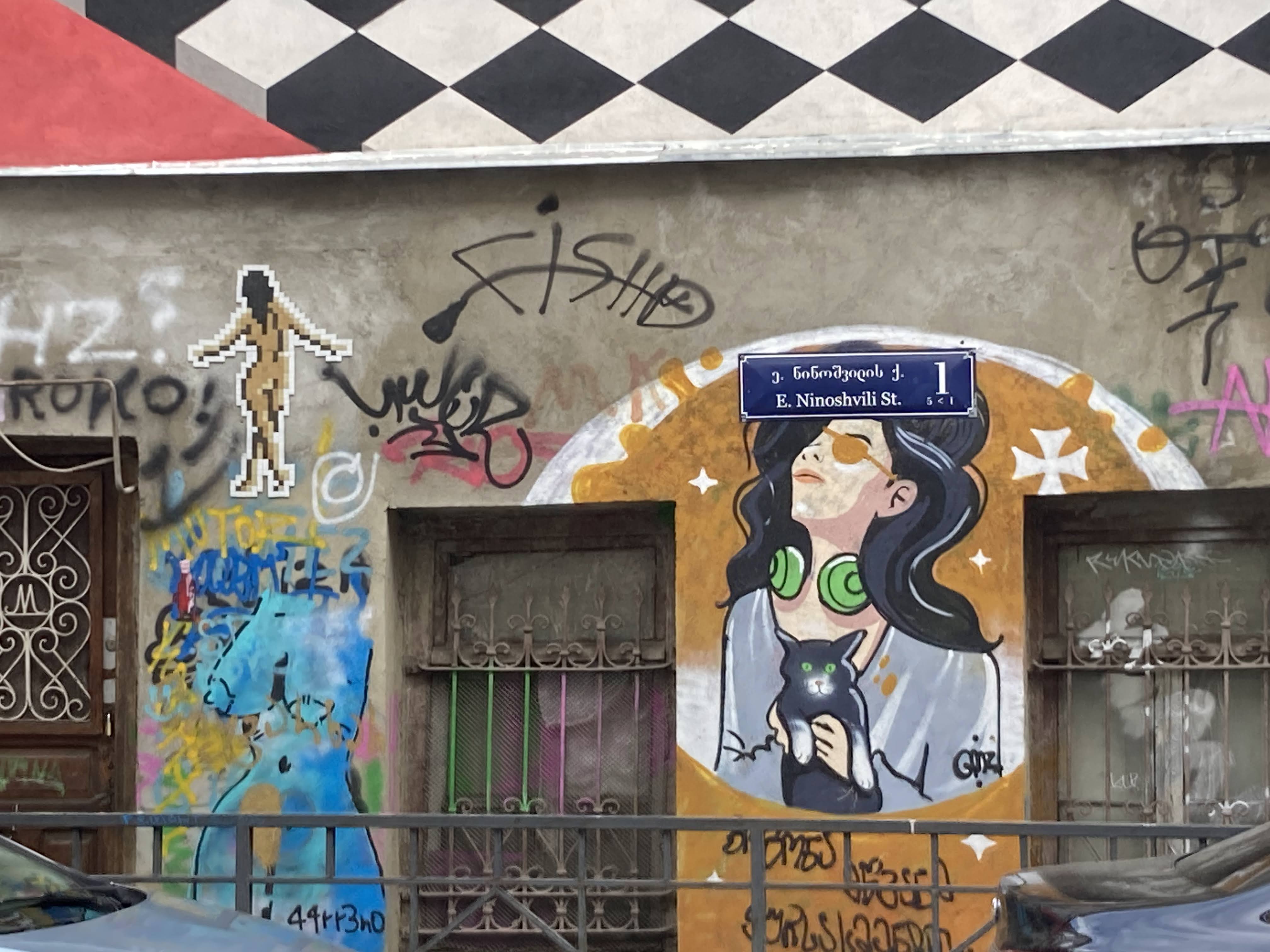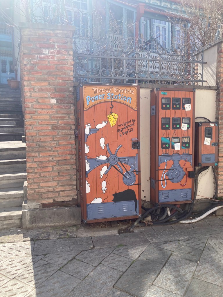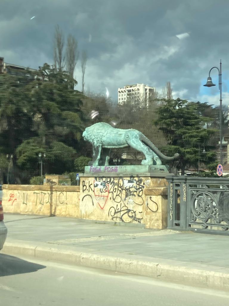I had fun feasting my eyes on the cats, dogs, the wall art of cats and dogs, the literal political writing on the walls, the Brutalist architecture coexisting with the traditional classical, the St. George’s square and Pushkin Park, the old city with its winding streets and the little unexpected parks, chestnuts roasting over an open fire, little restaurants with locals sitting with a glass of amber wine, delicately designed turquoise (They pronounce it turk-vase, because they adopted the colour as it looked Turkish and posh, centuries ago. Reminds you of how close the two countries are and how fraught their relationships) balconies. Here too, I could see people complaining about ugly modern buildings with ugh sensibilities marring beautiful historical structures. I suppose it’s a global march, this one of blending tastes.