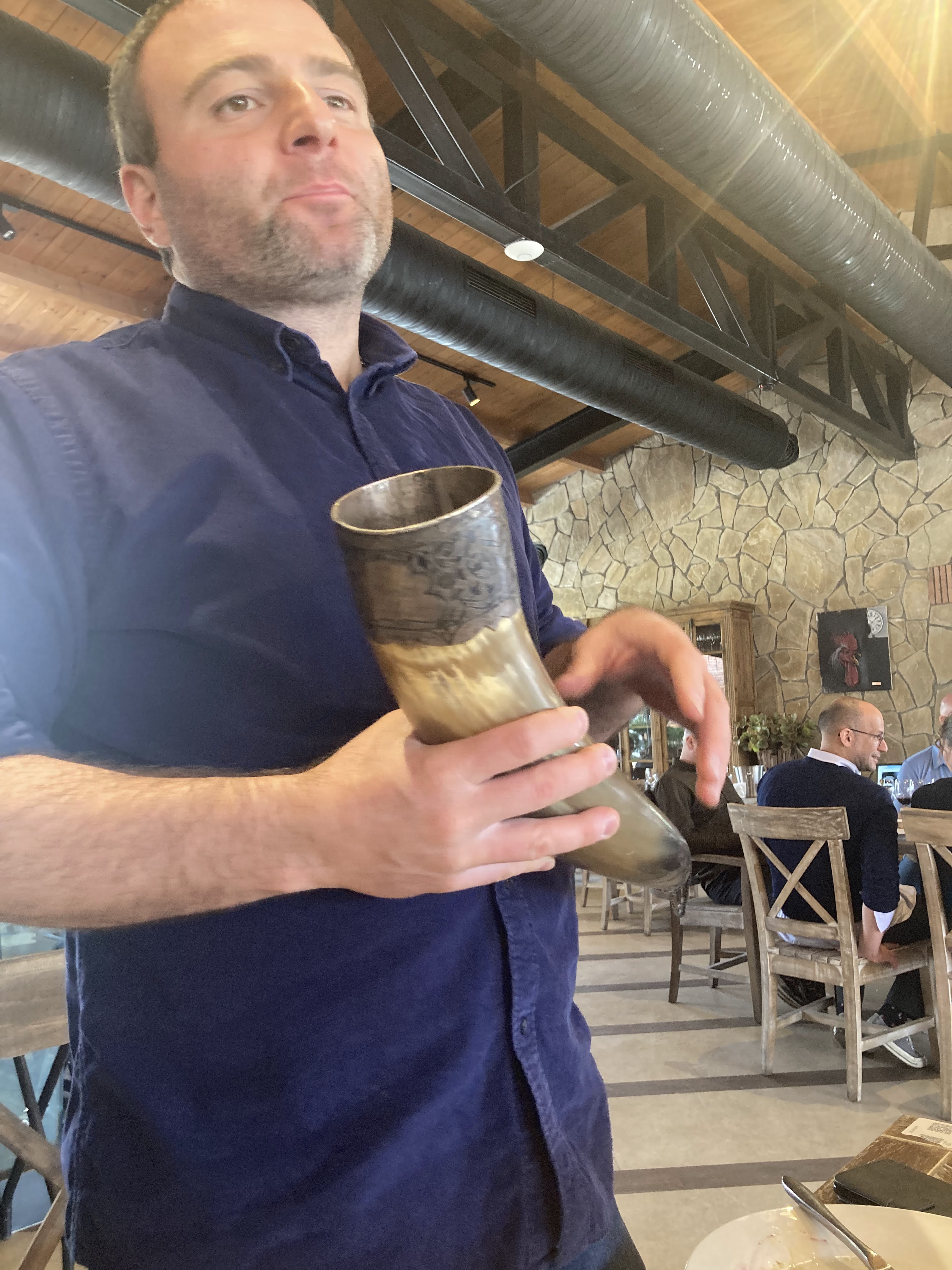 Vazha said that the average Georgian man drinks 2-3 bottles of wine at a traditional dinner and how they aren’t good at ageing wines except for special occasions, such as his grandfather ageing a qvevri for his wedding. He also showed us the drinking horn and spoke about how hosts passed on the full horns to men who were up for the challenge, then they have to chug it down and the host empties it on top of his own head to see if anything is left.
