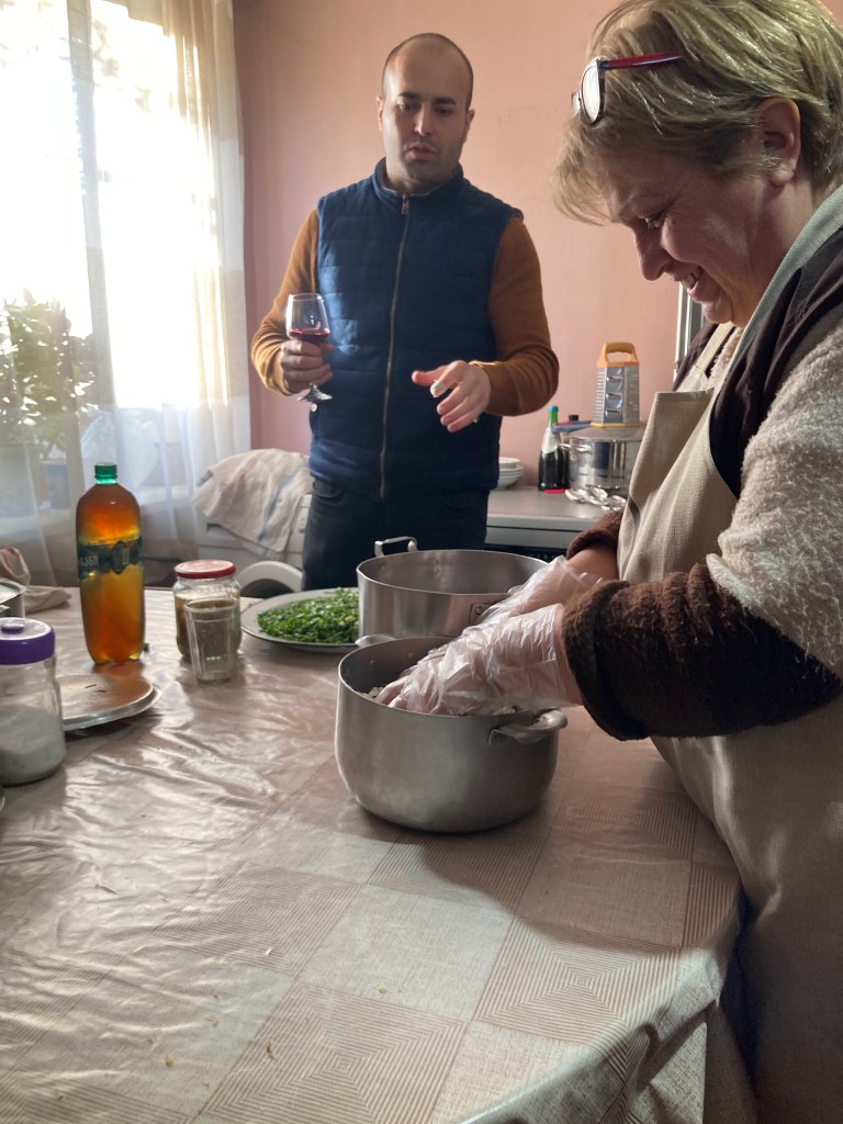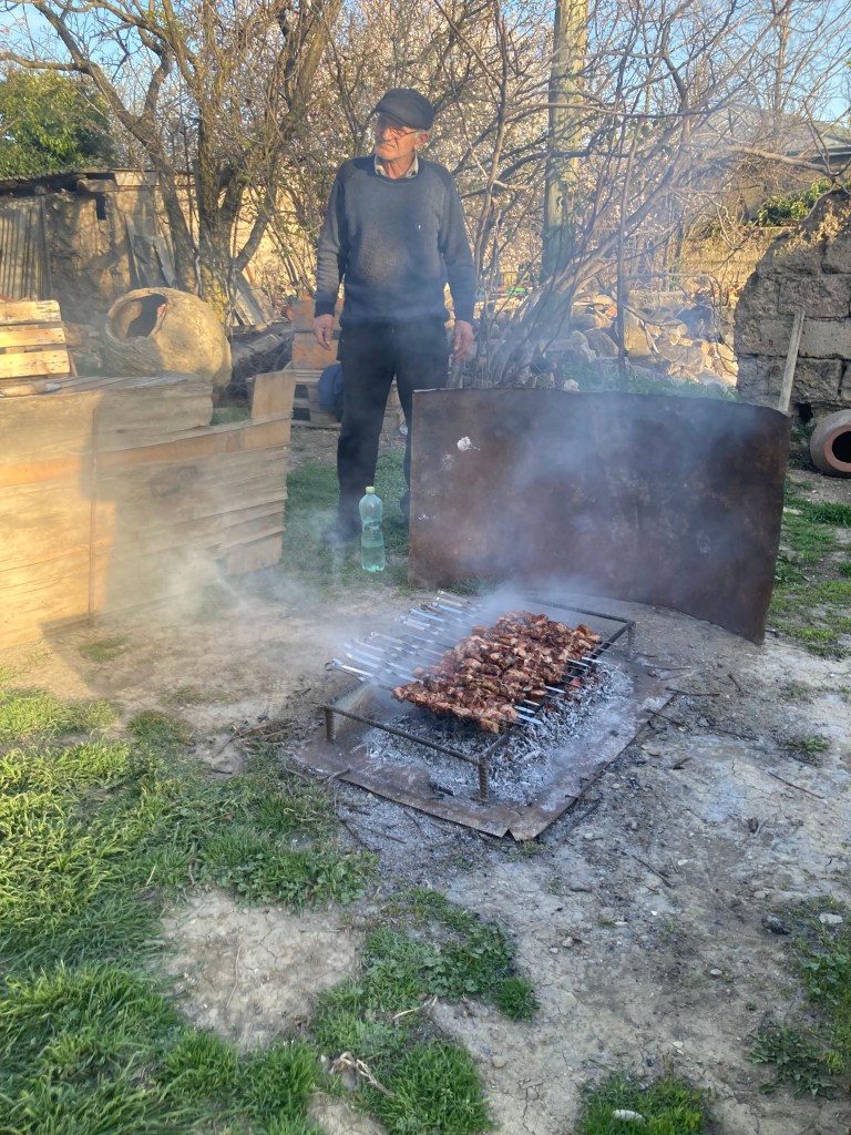 As daylight dimmed, we headed to the home of Bacho, who runs Burjanadze cellar, that produces about a 1000 bottles a year but these are wines. you can only buy at his winery and nowhere else. His father was getting some pork barbecued on dried grape vines. His mother was making chakapuli (veal with tarragon) and insisted on showing us how.