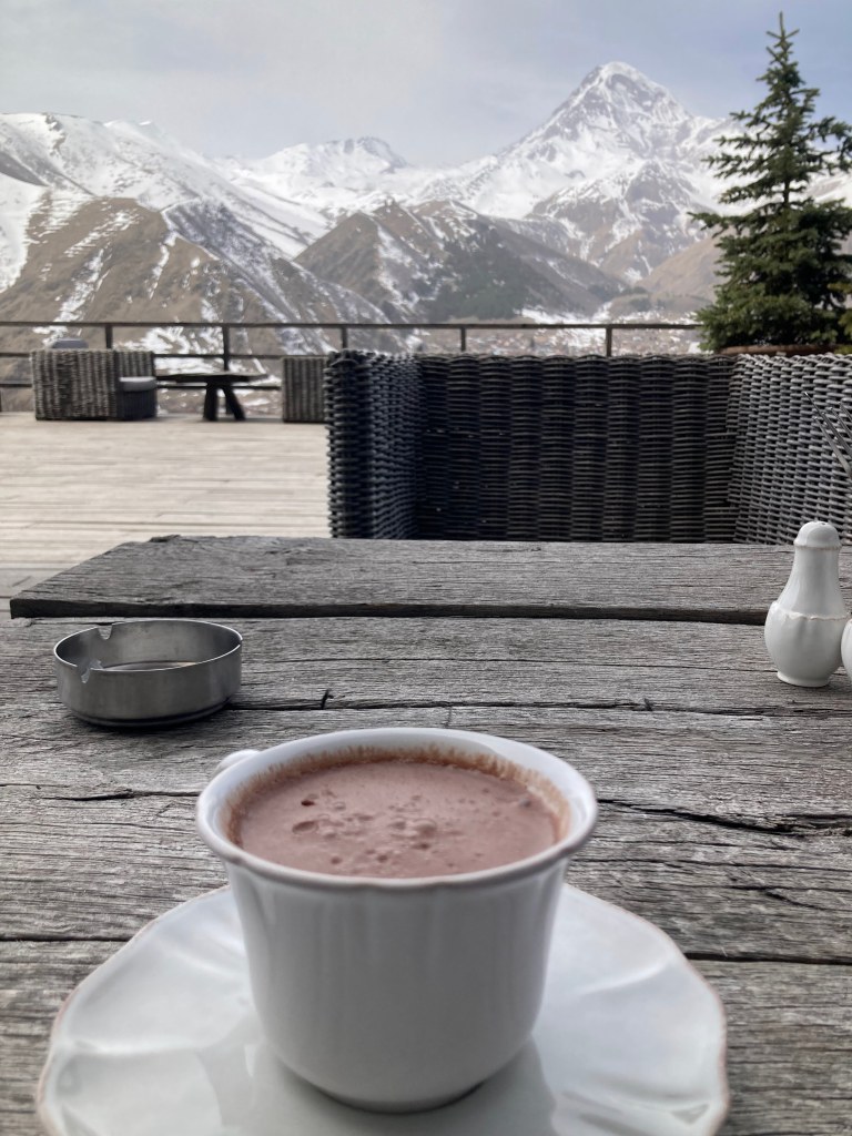 The views up close of Mt. Kazbeg were stunning, and I was ready to head back. I asked the young man who drove me there, Davit, if he could get me to Rooms Hotel, wait and drop me off to the Kobi gondola. He said he lives a minute away, so can get his lunch while I got mine, and for me to call him when I was ready. So, I raised a toast to Afsha who told me to have a hot chocolate with views of Mt. Kazbeg, and had lunch there, chilled with a book and in an hour, Davit collected me, warmed up and spoke about life at Kazbegi, his upcoming BnB and this time, as we got to Kobi uneventfully, I didn’t feel any of the concern that rode with me on the way out. Apparently, thinking the world is okay is that easy. Huh. No obsessive checking maps, no churning tummy, no waiting to exhale. What is this chilled out life? There I was, being okay with the world and myself.